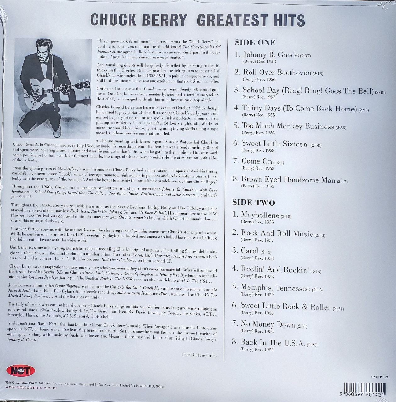 "Greatest Hits"، منتشرشده در 2021 توسط Not Now Music، مجموعهای از بهترینهای Chuck Berry است که حس انرژیک و نوستالژیک راک اند رول را با ملودیهای کلاسیک منتقل میکند. قطعات مانند "Johnny B. Goode" و "Roll Over Beethoven" از بهترینها هستند. کیفیت صدای وینیل 180 گرمی، با ریمسترینگ واضح، جزئیات گیتار Berry را به خوبی حفظ میکند، اما برخی کاربران از نویز سطحی یا کیفیت پرس متوسط گزارش دادهاند (امتیاز میانگین 4.5/5 در Discogs). بستهبندی گیتفولد، ارزش کلکسیونی بالایی دارد. این آلبوم برای طرفداران راک اند رول و کلکسیونرهای وینیل ضروری است.