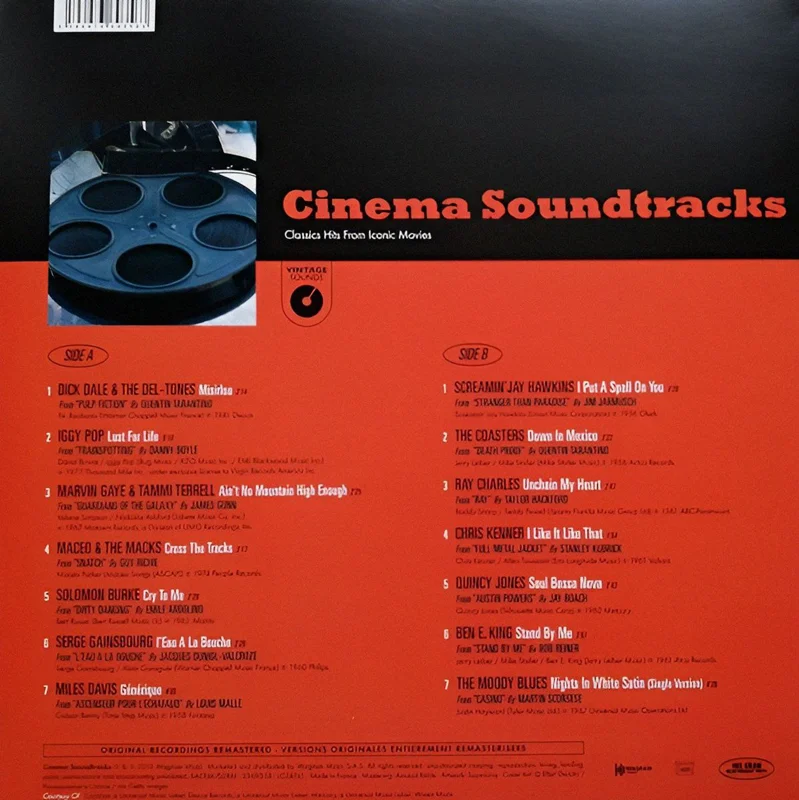 "Cinema Soundtracks"، منتشرشده در 2019 توسط Vintage Sounds، مجموعهای از هیتهای کلاسیک است که حس نوستالژیک فیلمهای معروف را با ملودیهای راک، سول و پاپ منتقل میکند. قطعات مانند "Misirlou" از Pulp Fiction و "Lust For Life" از Trainspotting از بهترینها هستند. کیفیت صدای وینیل 180 گرمی، با ریمسترینگ، شفاف و پویاست، اما برخی کاربران از نویز سطحی یا کیفیت پرس متوسط گزارش دادهاند (امتیاز میانگین 4.5/5 در Discogs). بستهبندی استاندارد، ارزش کلکسیونی متوسطی دارد. این آلبوم برای طرفداران موسیقی فیلم و کلکسیونرهای وینیل ایدهآل است.