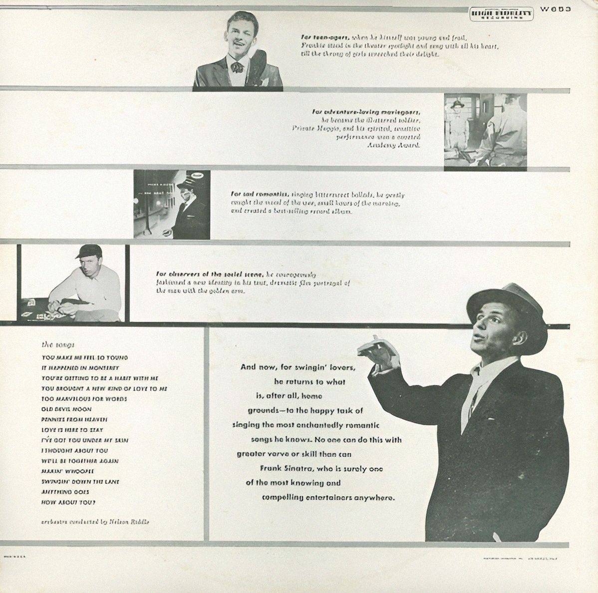 Frank Sinatra، "صدا"ی قرن بیستم، با همکاری Nelson Riddle در اواسط دهه 1950 بهترین دوره هنری خود را تجربه کرد. "Songs For Swingin' Lovers!" نقطه اوج این همکاری است و بسیاری از منتقدان آن را بهترین آلبوم سوئینگ تاریخ میدانند. این آلبوم اولین آلبوم 12 اینچی استریو استریو Capitol Sinatra بود و استاندارد جدیدی برای آلبومهای مفهومی پاپ و جاز تعیین کرد.