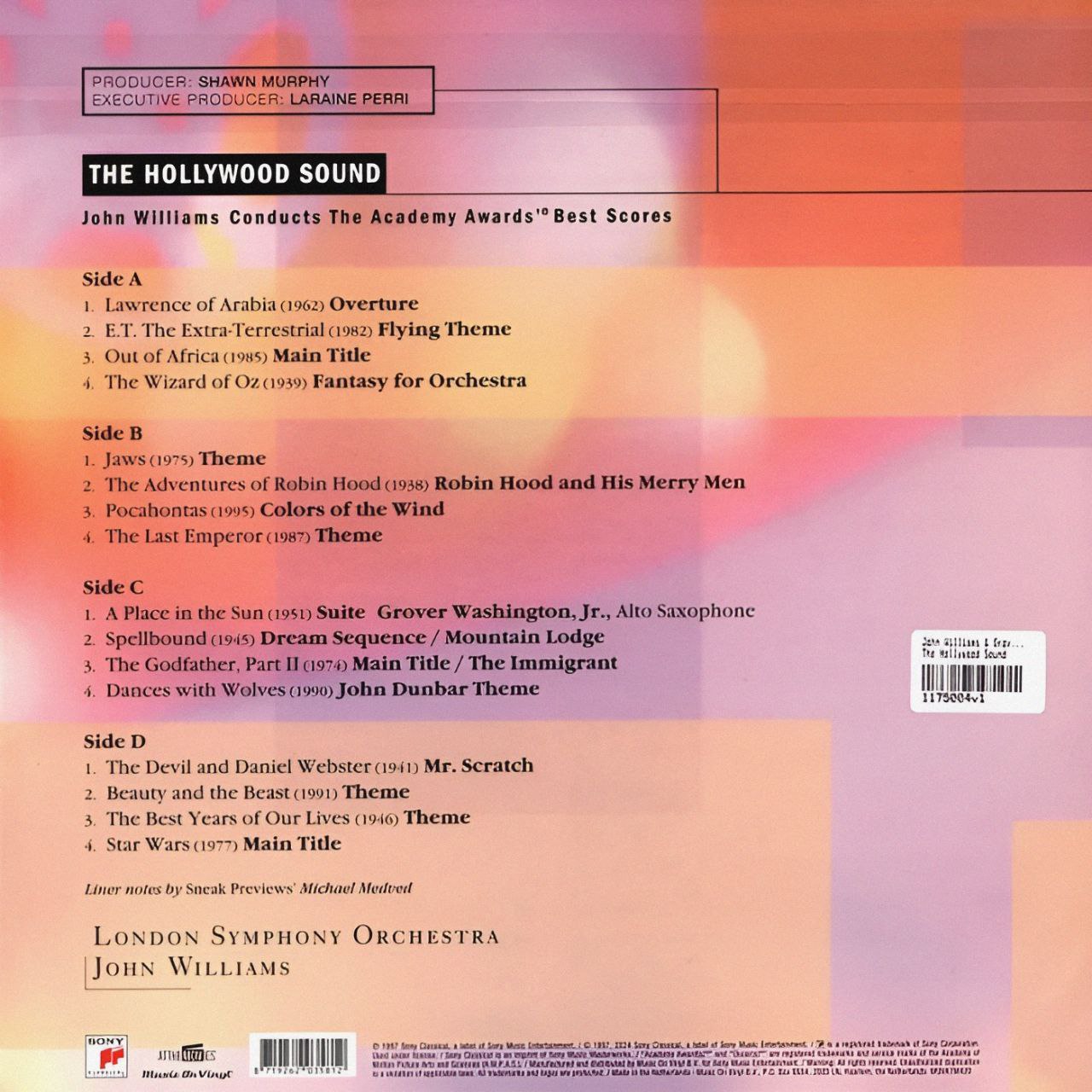 "The Hollywood Sound"، منتشرشده در 1997 و بازنشر شده در 2024 توسط Music On Vinyl، مجموعهای از بهترین موسیقی متنهای برنده اسکار است که توسط John Williams و London Symphony Orchestra اجرا شده. قطعات مانند "Jaws Theme"، "Star Wars Main Title" و "The Godfather Part II Main Title" با ارکستراسیون غنی، حس حماسی هالیوود را منتقل میکنند. همکاری Grover Washington Jr. در "A Place In The Sun"، تنوع را افزایش میدهد. کیفیت صدای وینیل گلد 180 گرمی، با مسترینگ واضح، جزئیات ارکستر و ساکسوفون را به خوبی حفظ میکند، اما برخی کاربران از نویز سطحی یا کیفیت پرس متوسط در نسخههای رنگی گزارش دادهاند (امتیاز میانگین 4.5/5 در Discogs). بستهبندی گیتفولد با insert، ارزش کلکسیونی بالایی دارد. این آلبوم برای طرفداران موسیقی فیلم و کلکسیونرهای وینیل ضروری است.