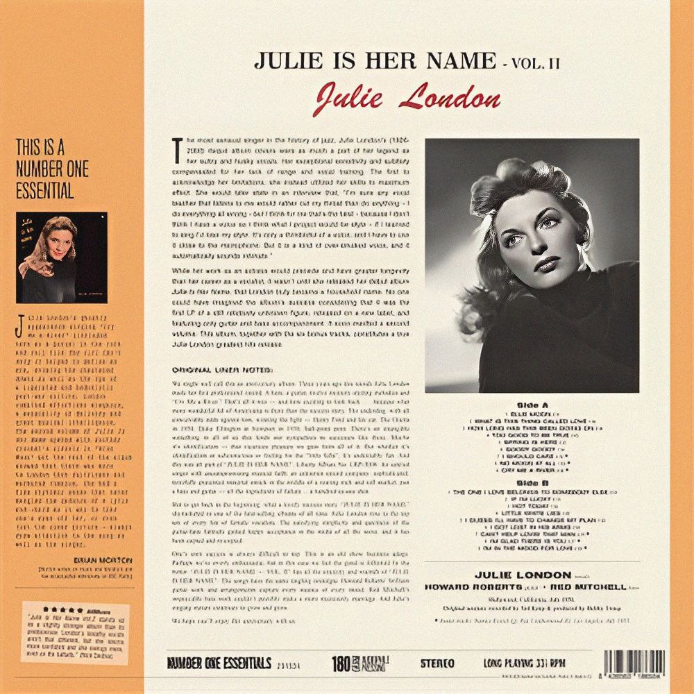 "Julie Is Her Name Volume 2"، منتشرشده در 1958 و بازنشر شده در 2012 بهصورت وینیل 180 گرمی توسط Analogue Productions، یکی از کلاسیکهای کول جاز است که صدای صمیمی London را با همراهی مینیمال برجسته میکند. قطعات مانند "Blue Moon" و "The Thrill Is Gone" با ملودیهای ساده و احساسی، حس نوستالژیک را منتقل میکنند. کیفیت صدای وینیل ریمستر شده توسط Kevin Gray، شفاف و گرم است، اما برخی کاربران از نویز سطحی یا کیفیت پرس متوسط گزارش دادهاند (امتیاز میانگین 4.5/5 در Discogs). بستهبندی استاندارد، ارزش کلکسیونی بالایی دارد. این آلبوم برای طرفداران جاز و کلکسیونرهای وینیل ضروری است.