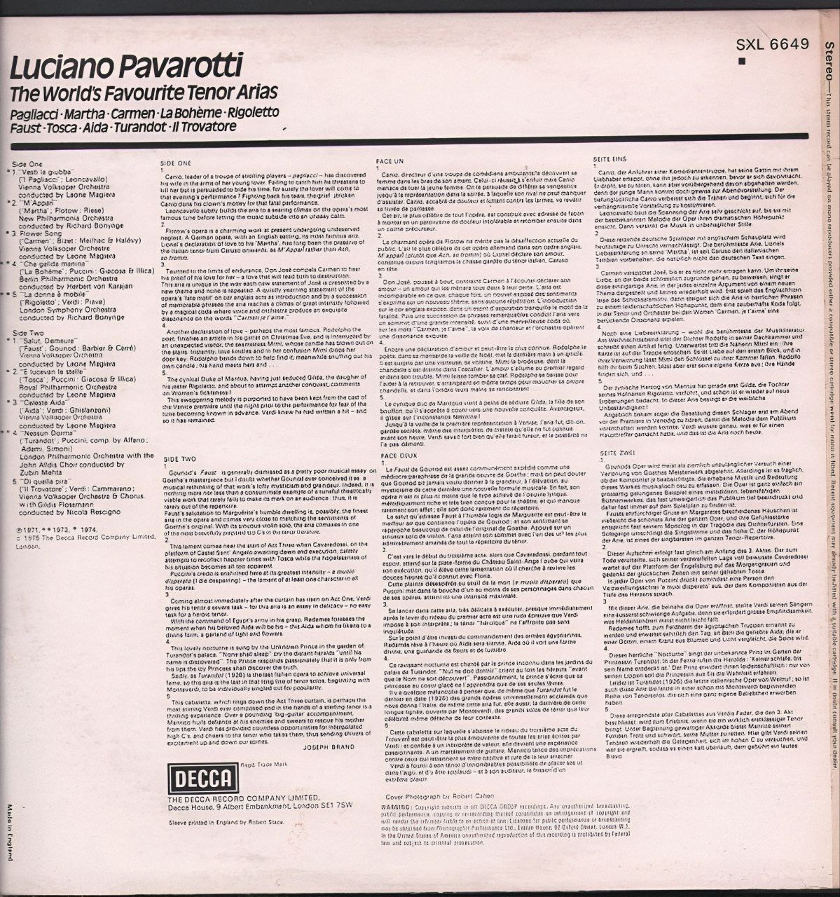 "The World's Favourite Tenor Arias"، منتشرشده در 1975 و بازنشر شده در 2025 به مناسبت 50مین سالگرد توسط Decca Records، مجموعهای از آریاهای محبوب تنور است که صدای Pavarotti را در اوج قدرت به نمایش میگذارد. قطعات مانند "Nessun Dorma" با حس حماسی و "La Donna è Mobile" با ملودیهای شاد، تنوع اپرایی را نشان میدهند. کیفیت صدای وینیل 180 گرمی، با ریمستر HD صوتی جدید، شفاف و پویاست و جزئیات وکال و ارکستر را به خوبی حفظ میکند، اما برخی کاربران از نویز سطحی یا کیفیت پرس متوسط در نسخههای اولیه گزارش دادهاند (امتیاز میانگین 4.5/5 در Discogs). بستهبندی استاندارد با آستین داخلی، ارزش کلکسیونی بالایی دارد. این آلبوم برای طرفداران تنور، اپرا و کلکسیونرهای وینیل ضروری است.