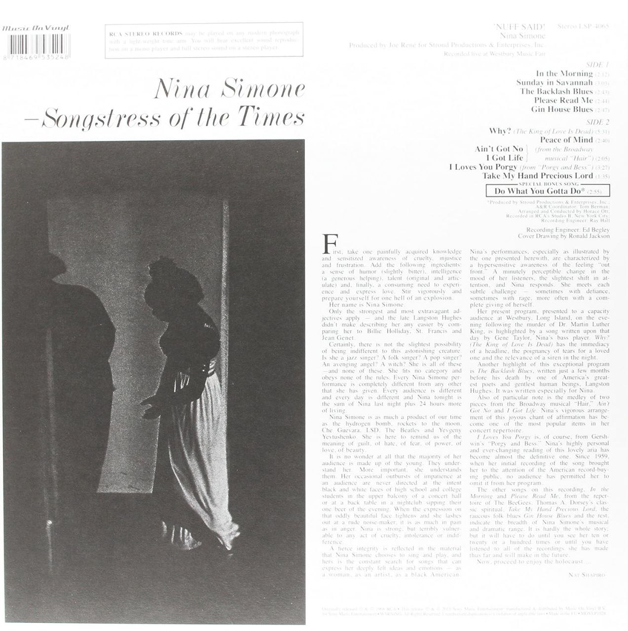 Nina Simone ، ملقب به "High Priestess of Soul"، پیانیست کلاسیک، خواننده جاز، سول و فعال حقوق مدنی بود. او با صدای منحصربهفرد ۴ اکتاوی و اجراهای پراحساس، یکی از تأثیرگذارترین هنرمندان قرن بیستم است. Nuff Said! تنها سه روز پس از ترور مارتین لوتر کینگ ضبط شد و به یاد او تقدیم گردید.