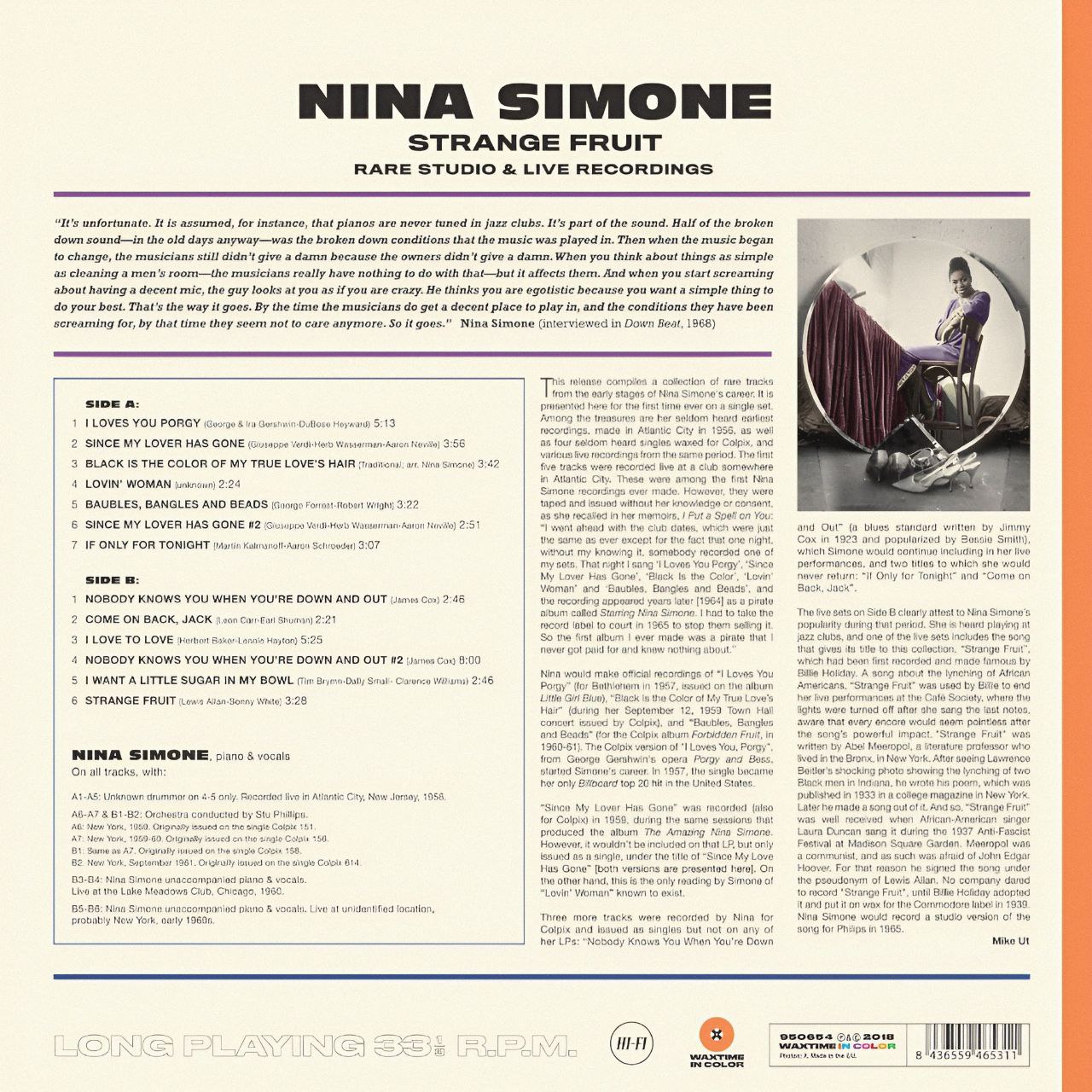 "Strange Fruit"، منتشرشده در 2018 توسط WaxTime In Color، مجموعهای از ضبطهای نادر Nina Simone از اوایل دهه 1950 است که حس خام و احساسی او را منتقل میکند. قطعات مانند "I Loves You Porgy" و "Black Is The Color" با پیانو و وکال بدون همراهی، از بهترینها هستند. "Strange Fruit"، کاور Billie Holiday، عمق سیاسی او را نشان میدهد. کیفیت صدای وینیل اورنج 180 گرمی، با ریمسترینگ، شفاف و گرم است، اما برخی کاربران از نویز سطحی یا کیفیت پرس متوسط در نسخههای رنگی گزارش دادهاند (امتیاز میانگین 4.0/5 در Discogs). بستهبندی استاندارد، ارزش کلکسیونی متوسطی دارد. این آلبوم برای طرفداران جاز و کلکسیونرهای وینیل ضروری است.