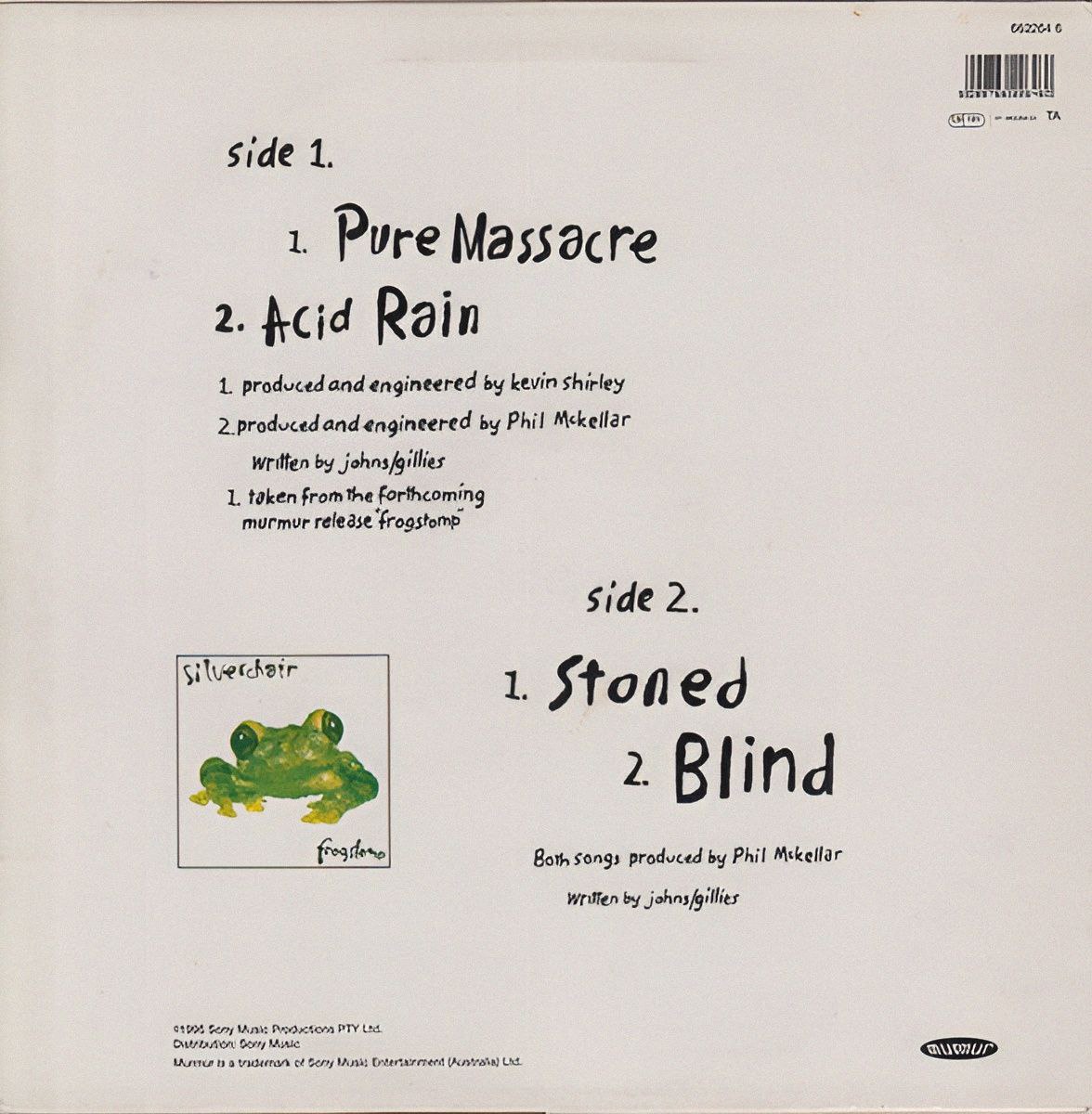 "Pure Massacre" ، منتشرشده در 1995 و بازنشر شده در 2023 توسط Music On Vinyl، یکی از آثار کلیدی Silverchair است که با "Pure Massacre" و "Tomorrow"، حس خشم و انرژی گرانج را منتقل میکند. "Faultline" و "Stoned" قدرت و تنوع گروه را نشان میدهند. کیفیت صدای وینیل 180 گرمی ترانسولنت گرین ماربل، با ریمسترینگ واضح توسط John Webber، جزئیات گیتارهای سنگین و درام را به خوبی حفظ میکند، اما برخی کاربران از نویز سطحی در پرسهای ماربل گزارش دادهاند (امتیاز میانگین 4.5/5 در Discogs). بستهبندی با insert شامل تصاویر گروه، ارزش کلکسیونی بالایی دارد. این EP برای طرفداران گرانج و کلکسیونرهای وینیل ضروری است.